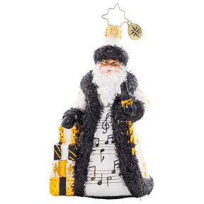 In a unique black-and-white coat embellished with musical notes, this sweet-sounding Santa marches to the beat of his own drum. Handmade in Europe.